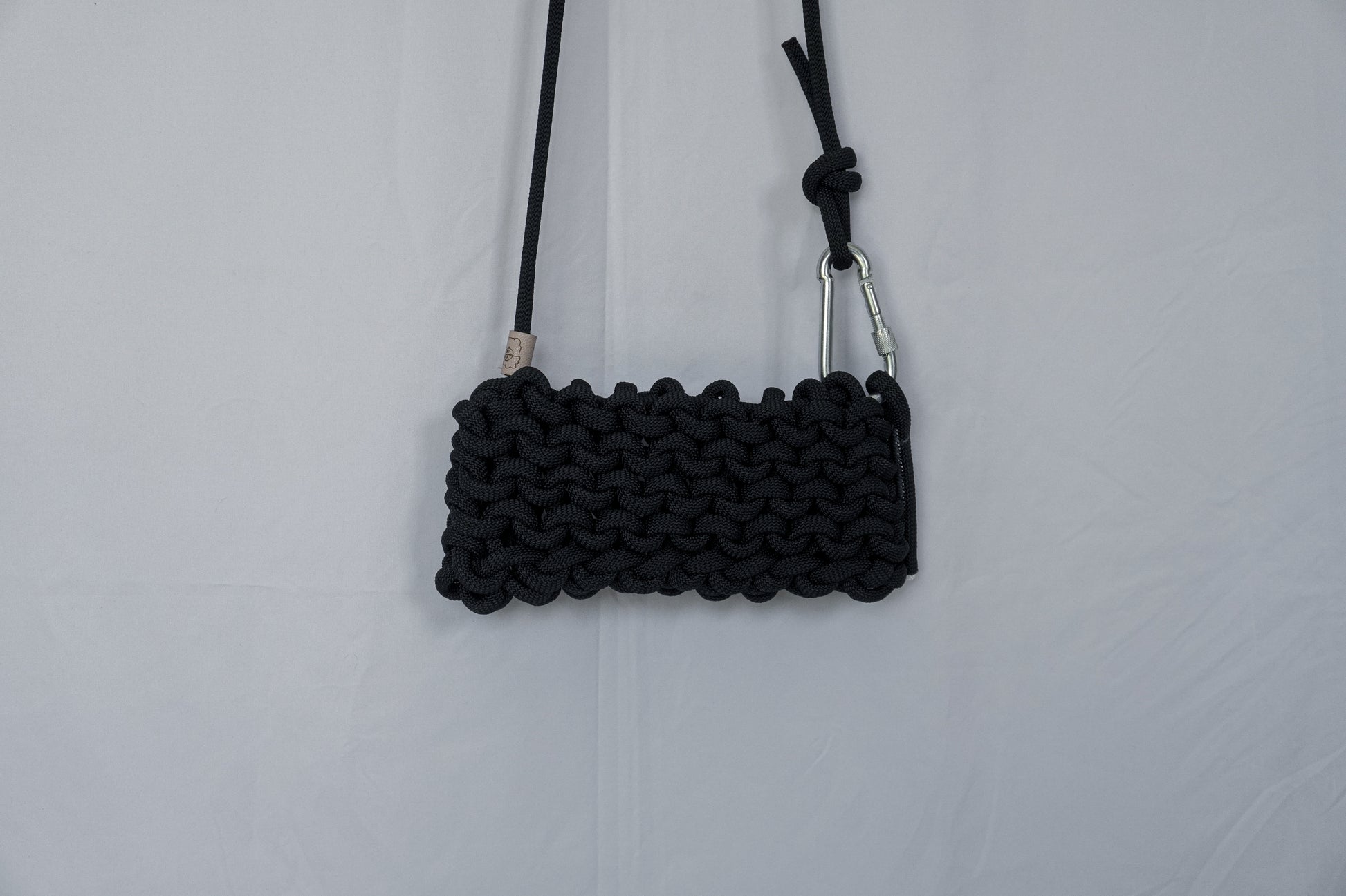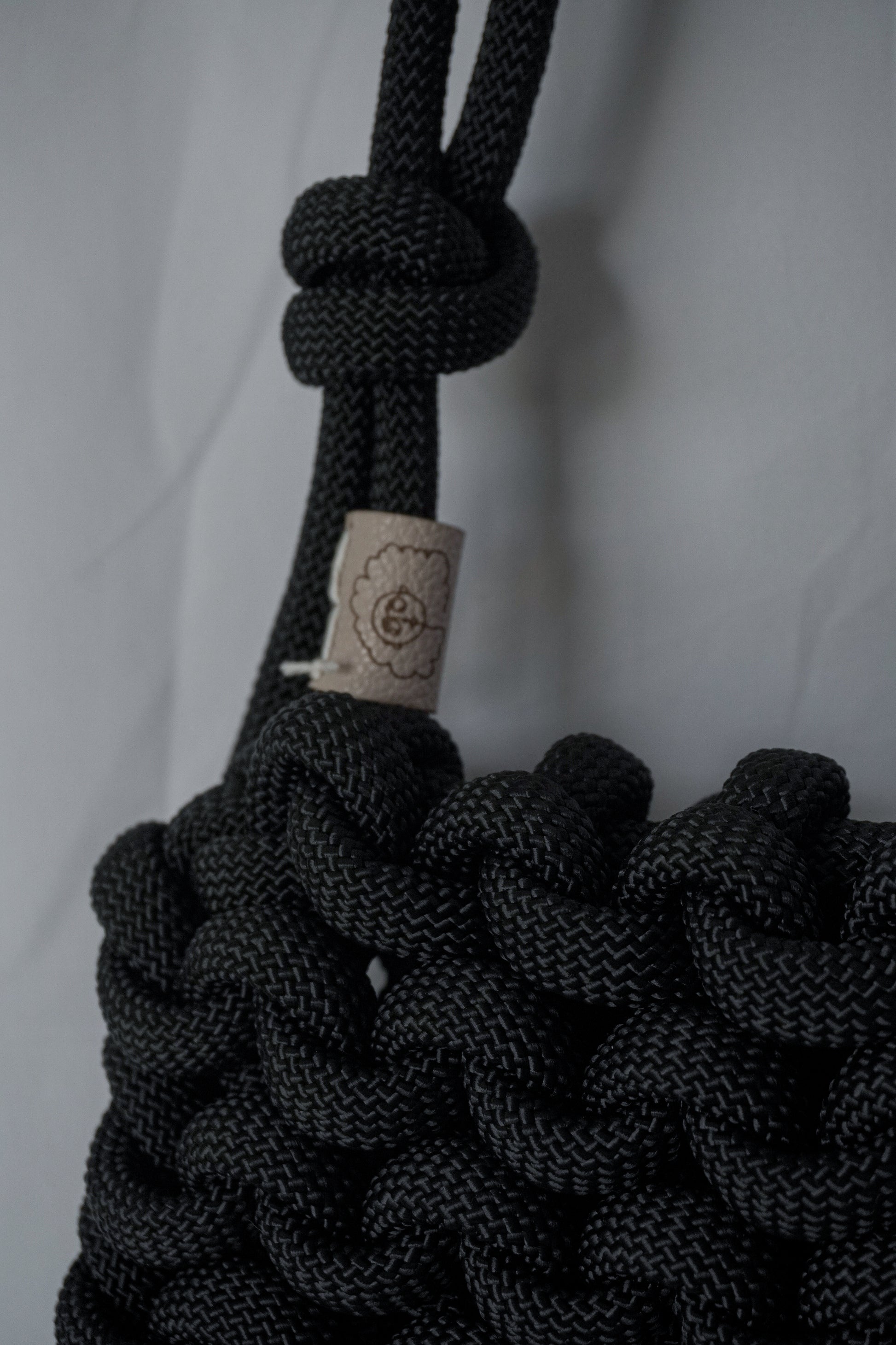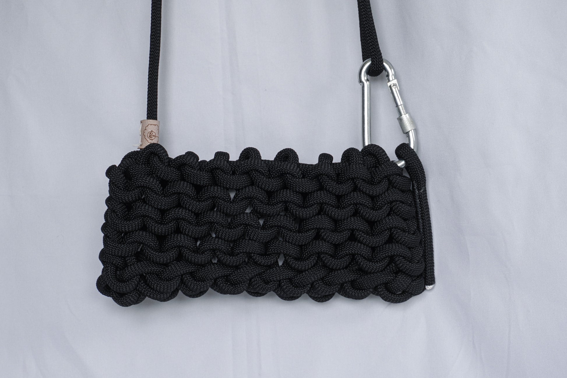 Belay shoulder bag/crossbody (asa ajustable) tejida a mano con cuerda en color negro. Cada pieza es única e irrepetible, ya que está elaborada de forma artesanal. Incluye un mosquetón de escalada que la hace funcional y distintiva.