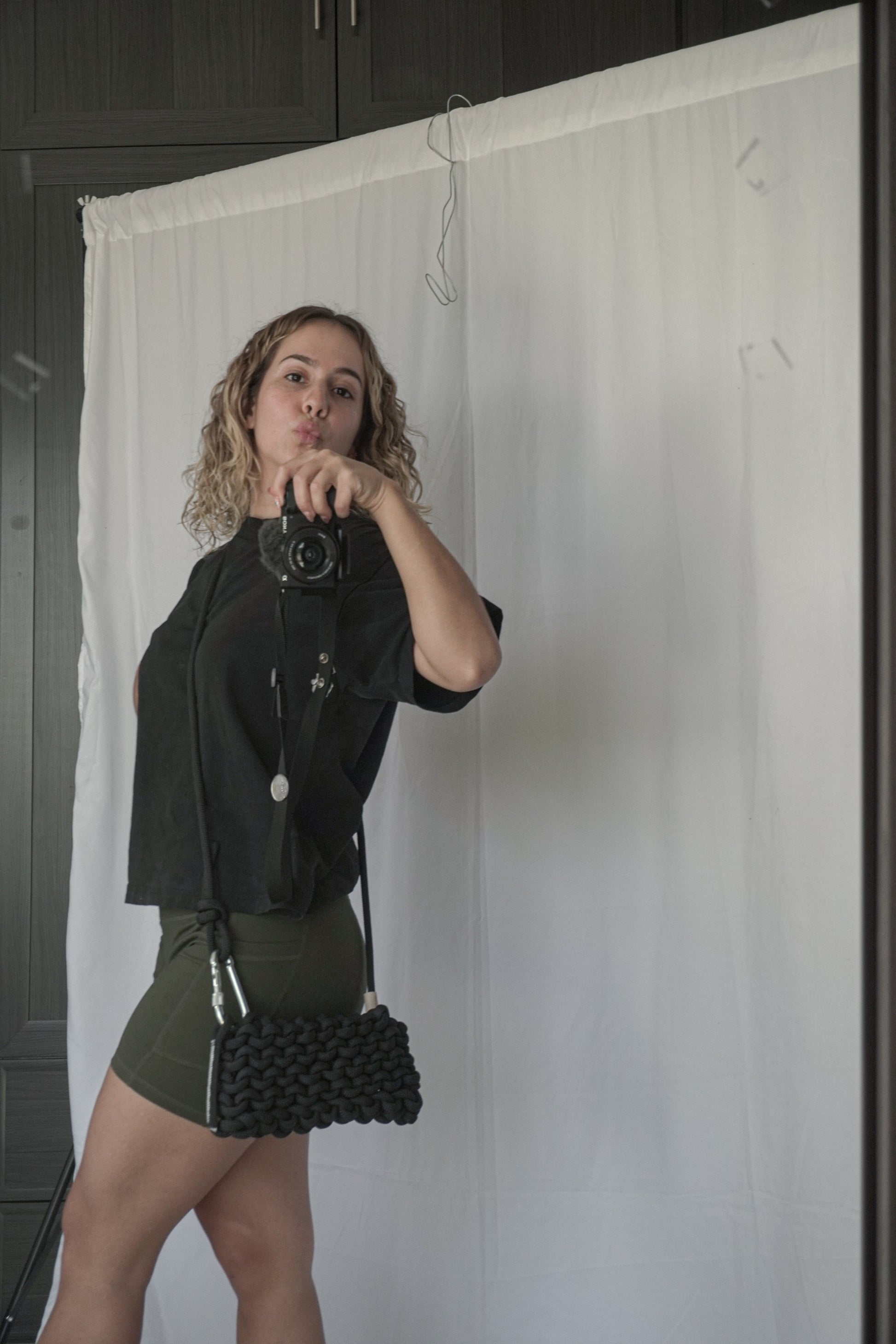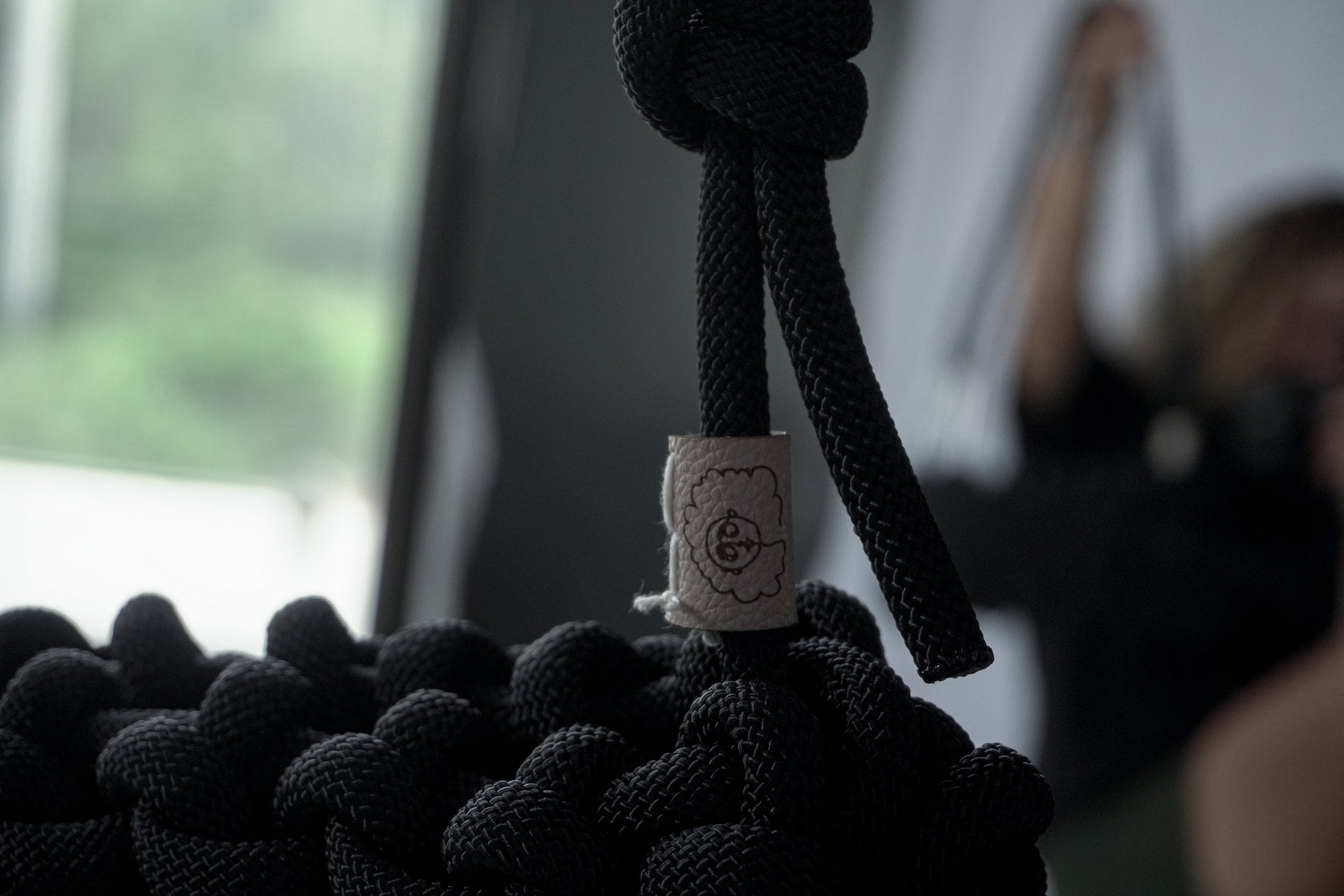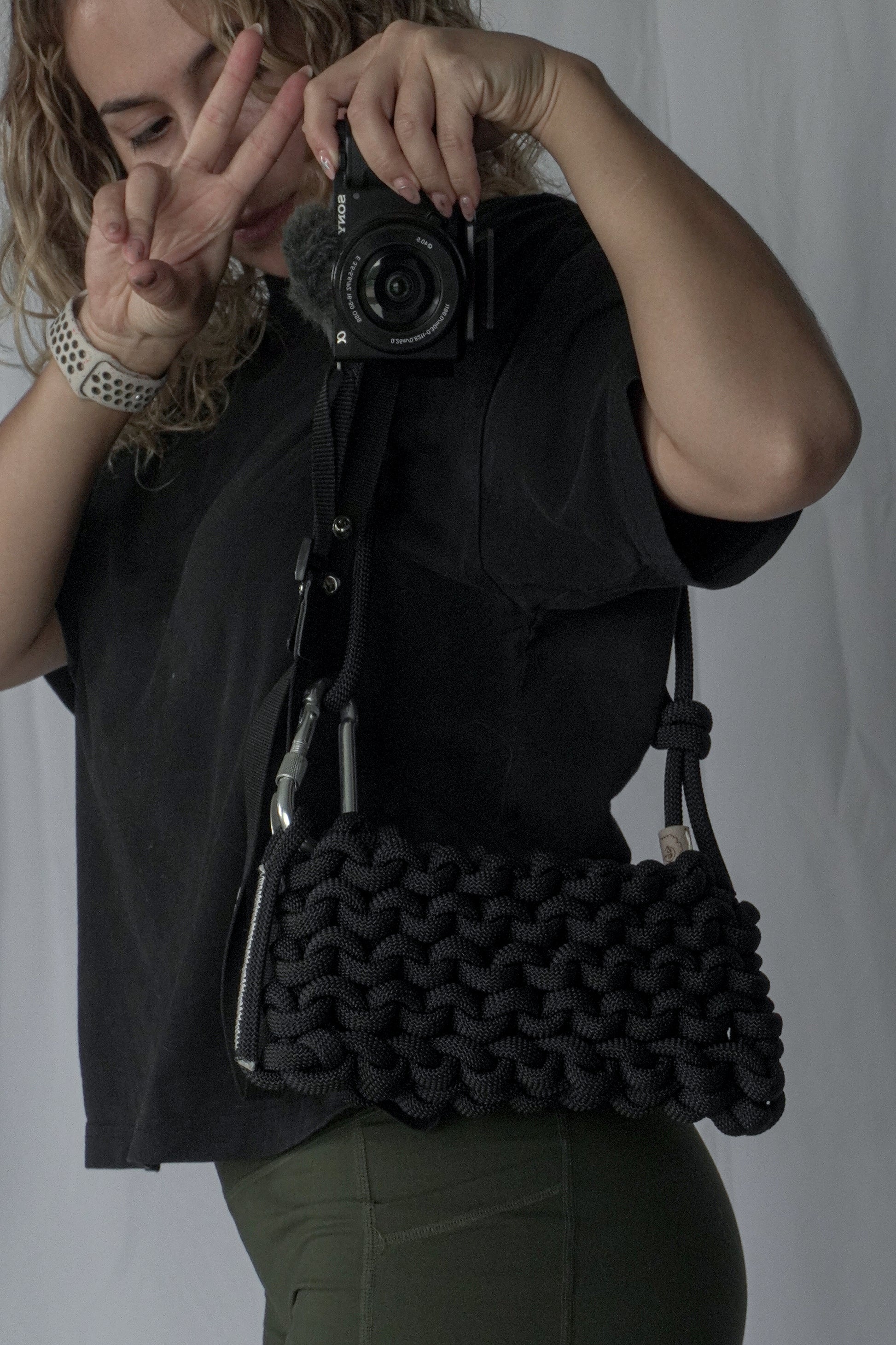 Belay shoulder bag/crossbody (asa ajustable) tejida a mano con cuerda en color negro. Cada pieza es única e irrepetible, ya que está elaborada de forma artesanal. Incluye un mosquetón de escalada que la hace funcional y distintiva.
