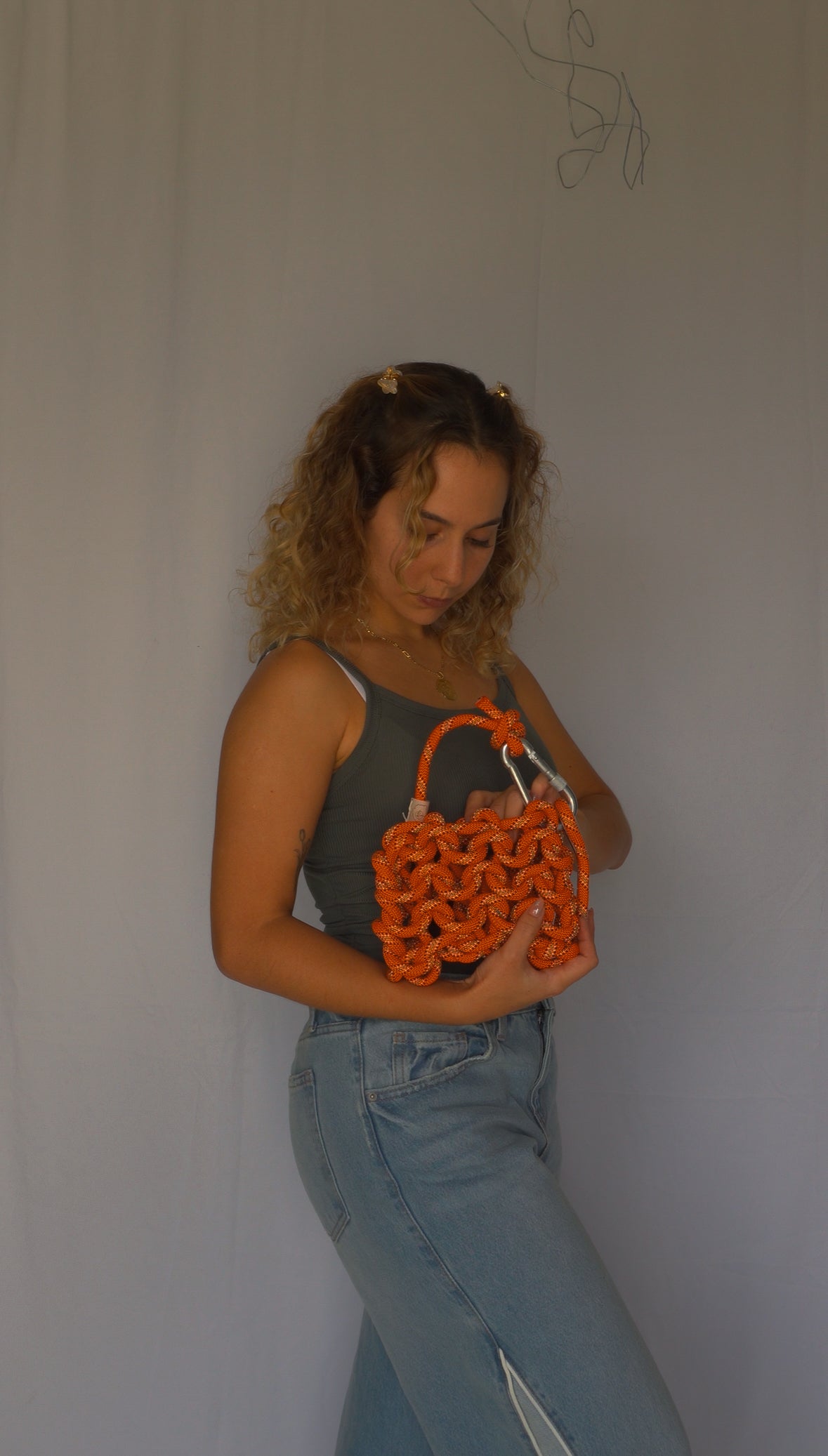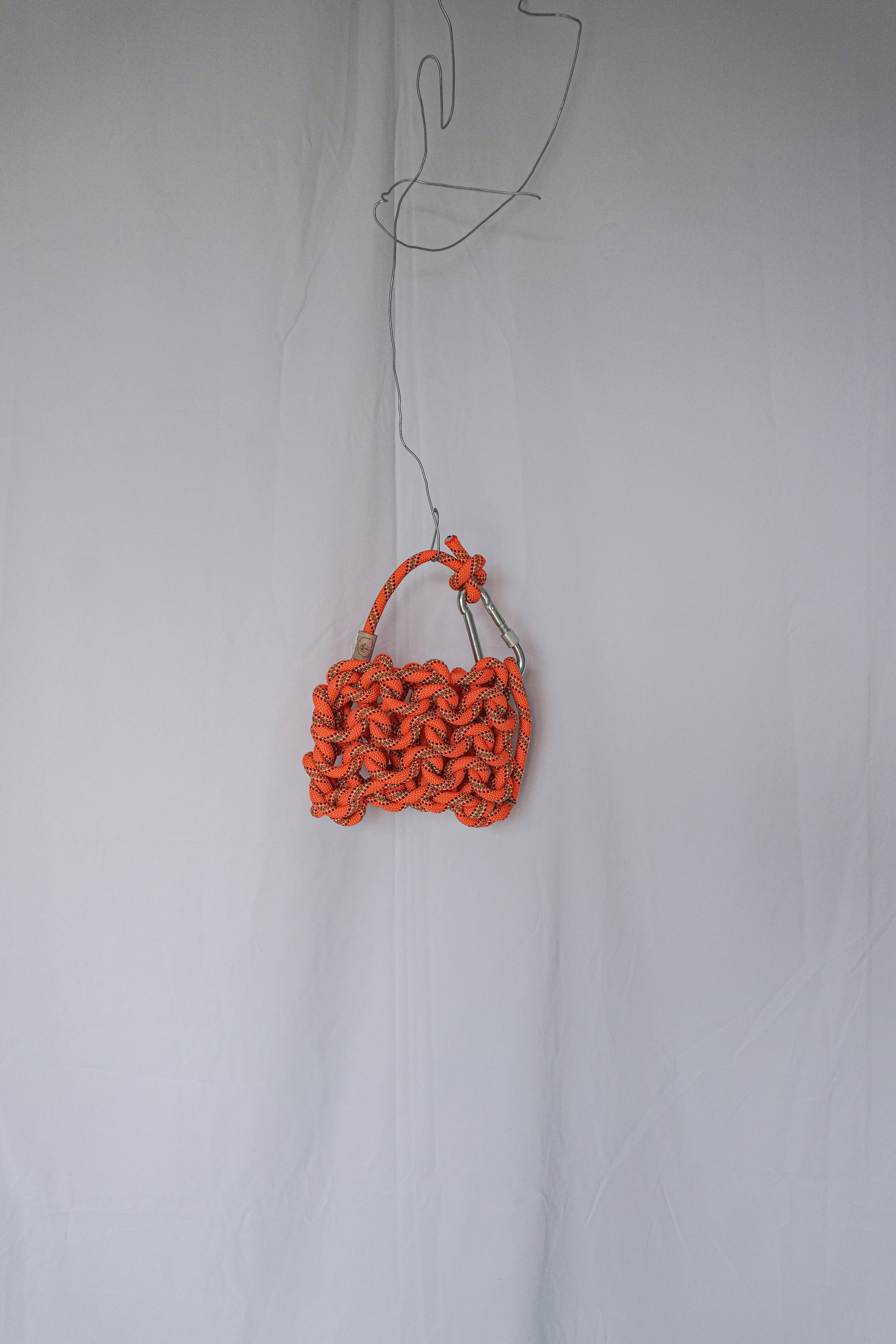 Belay handbag tejida a mano con cuerda de escalador en color naranja. Cada pieza es única e irrepetible, ya que está elaborada de forma artesanal. Incluye un mosquetón de escalada que la hace funcional y distintiva.