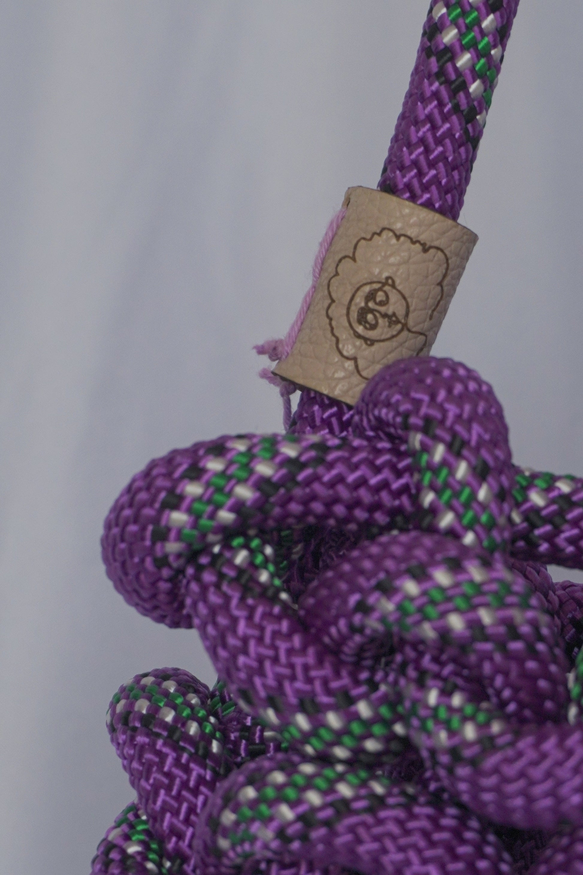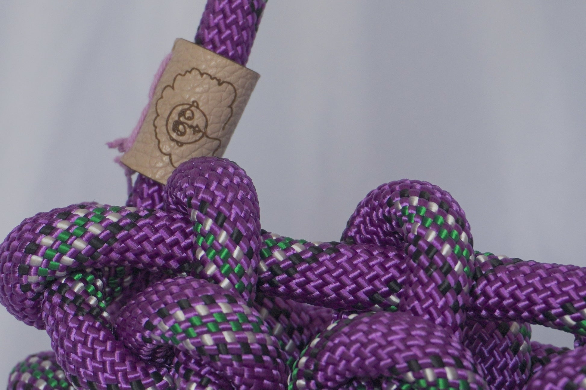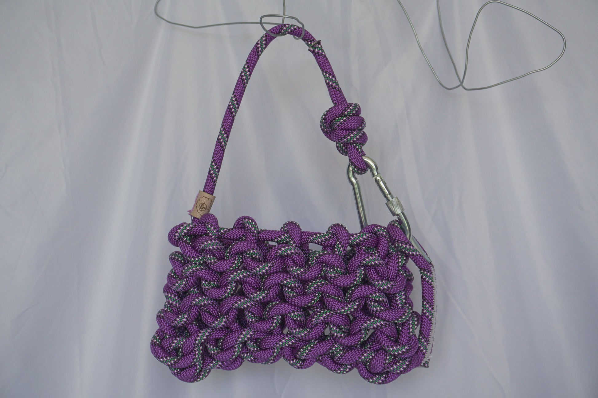 Belay shoulder bag #7 tejida a mano con cuerda de escalador en color morado. Cada pieza es única e irrepetible, ya que está elaborada de forma artesanal. Incluye un mosquetón de escalada que la hace funcional y distintiva.