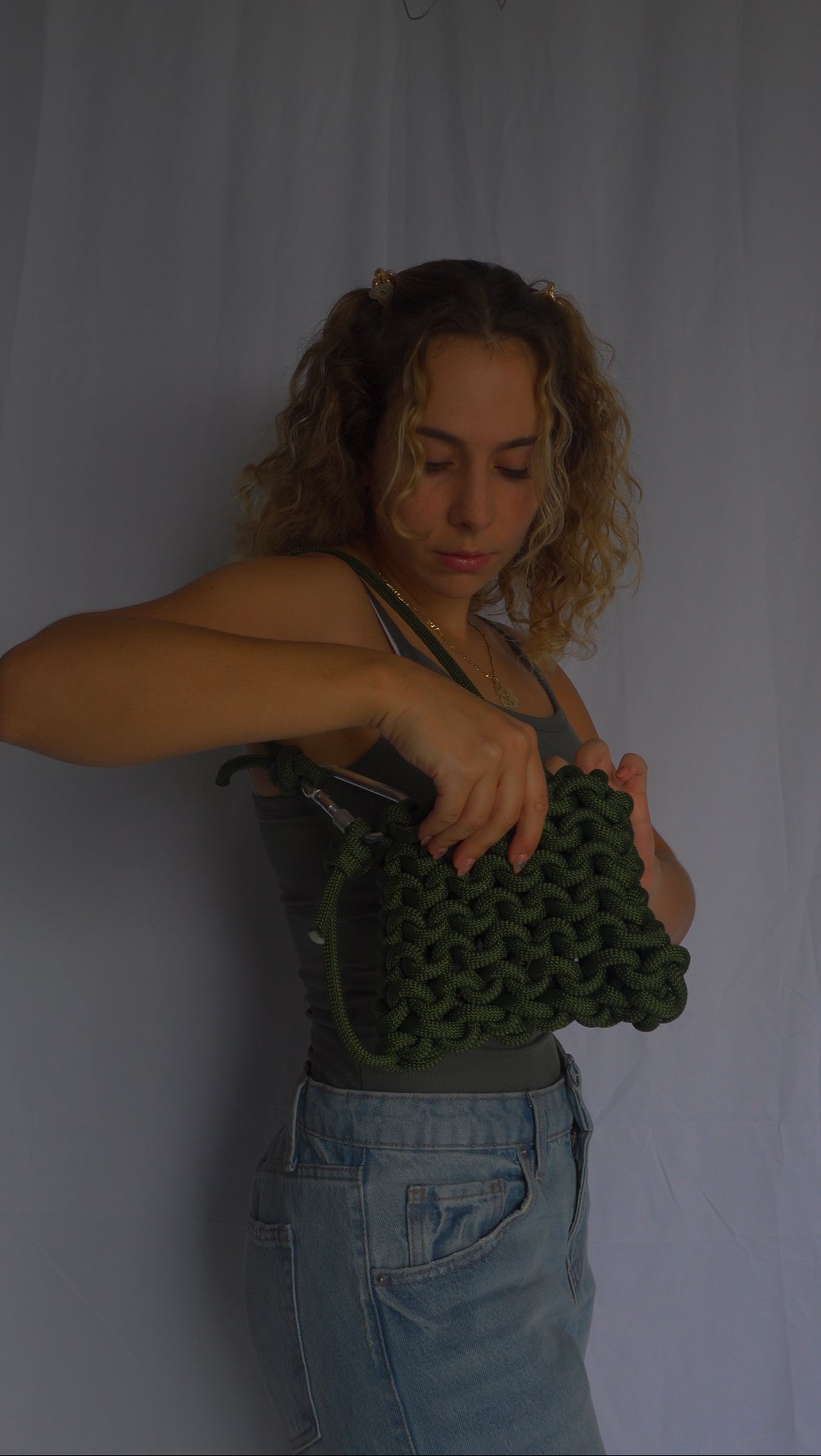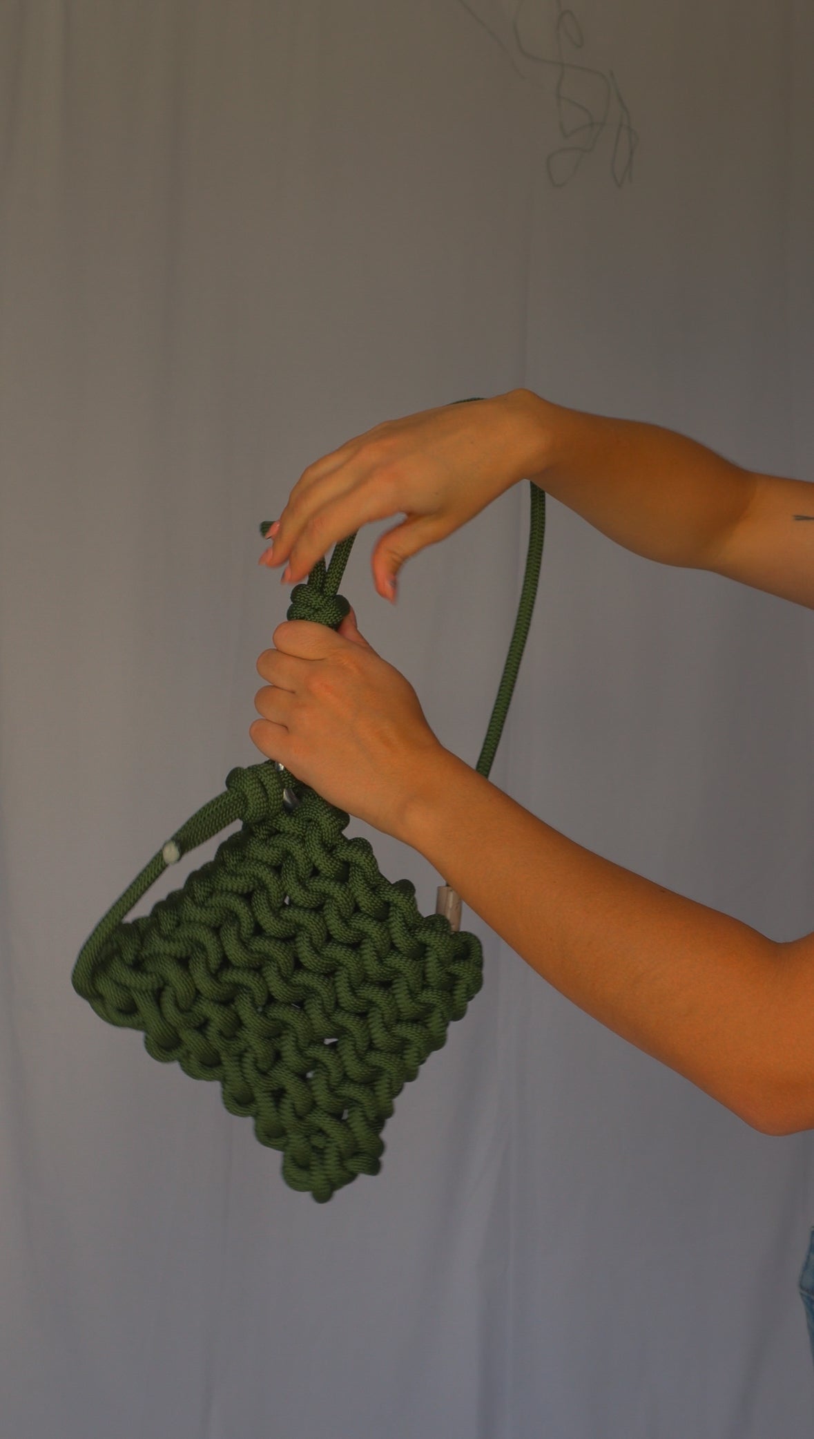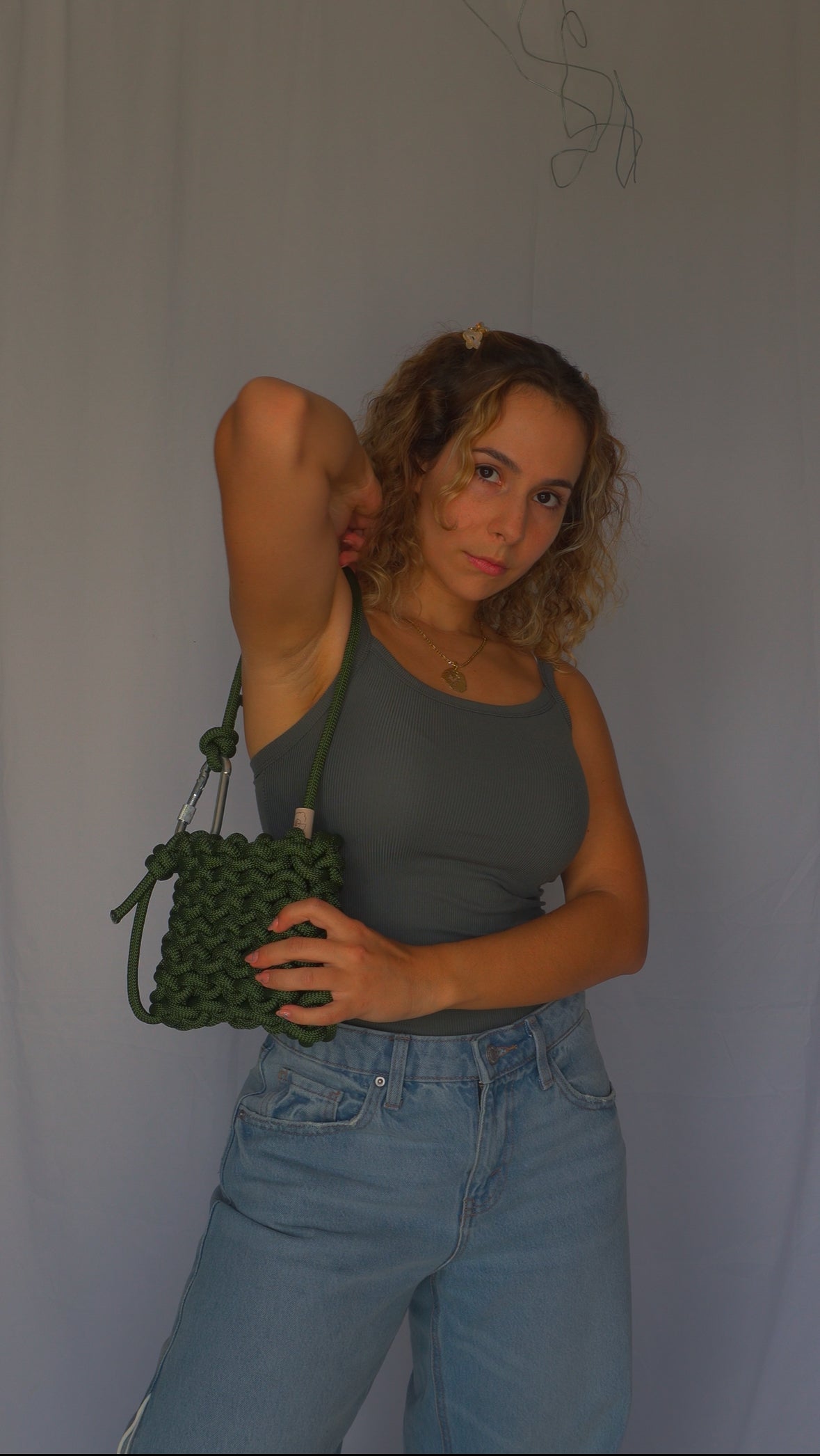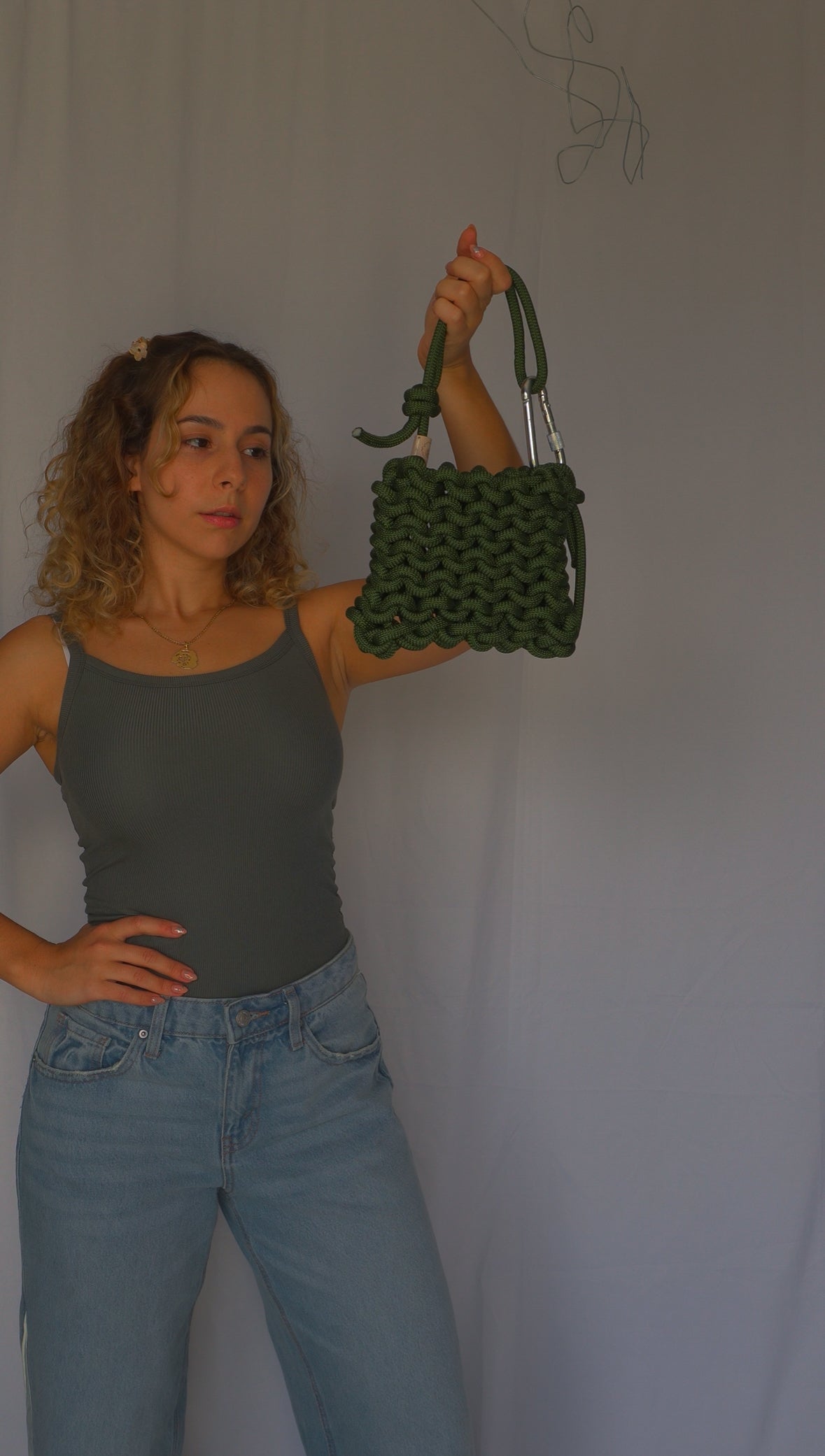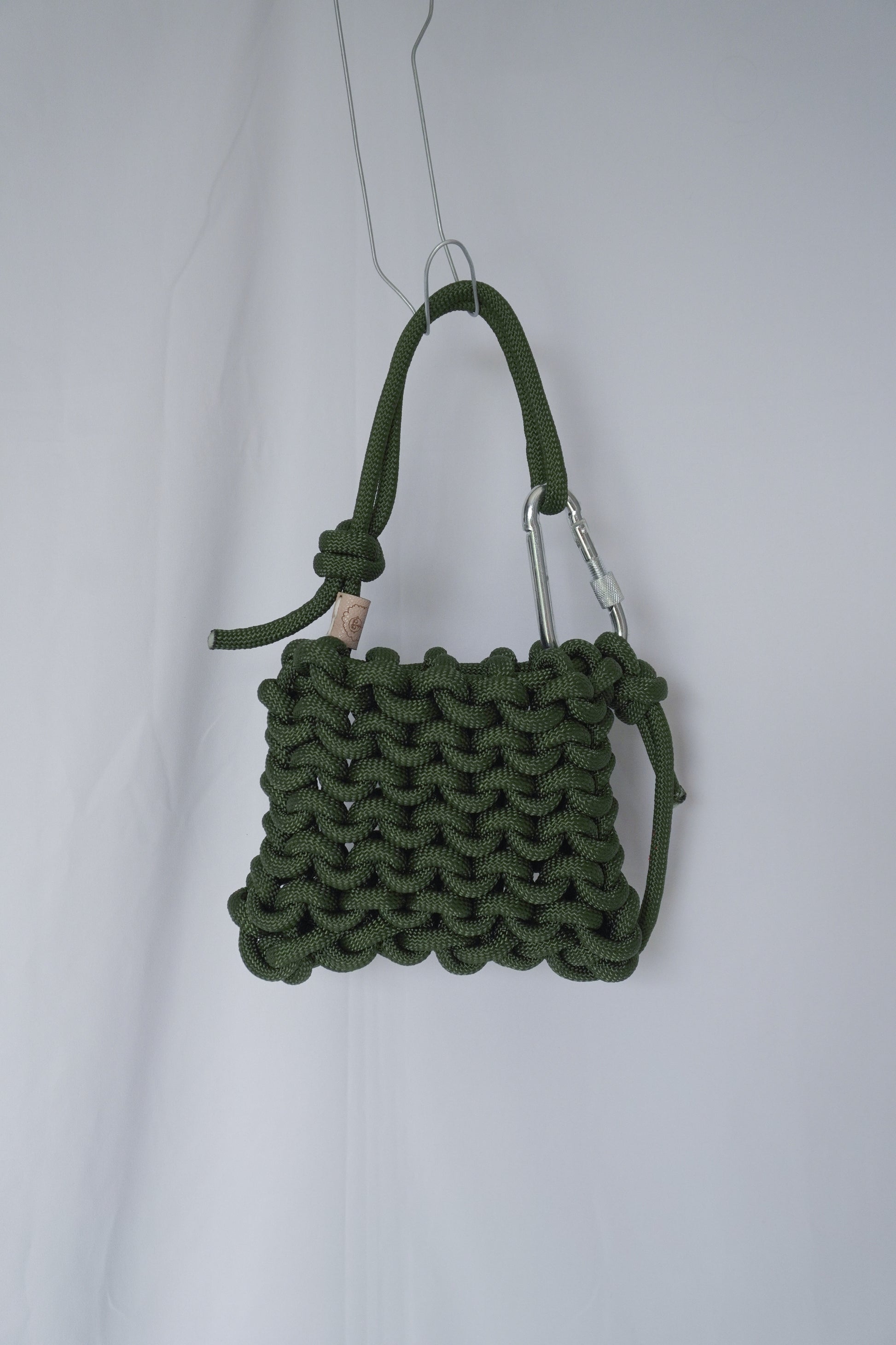 Belay shoulder bag/handbag (asa ajustable) tejida a mano con cuerda de escalador en color verde militar. Cada pieza es única e irrepetible, ya que está elaborada de forma artesanal. Incluye un mosquetón de escalada que la hace funcional y distintiva.
