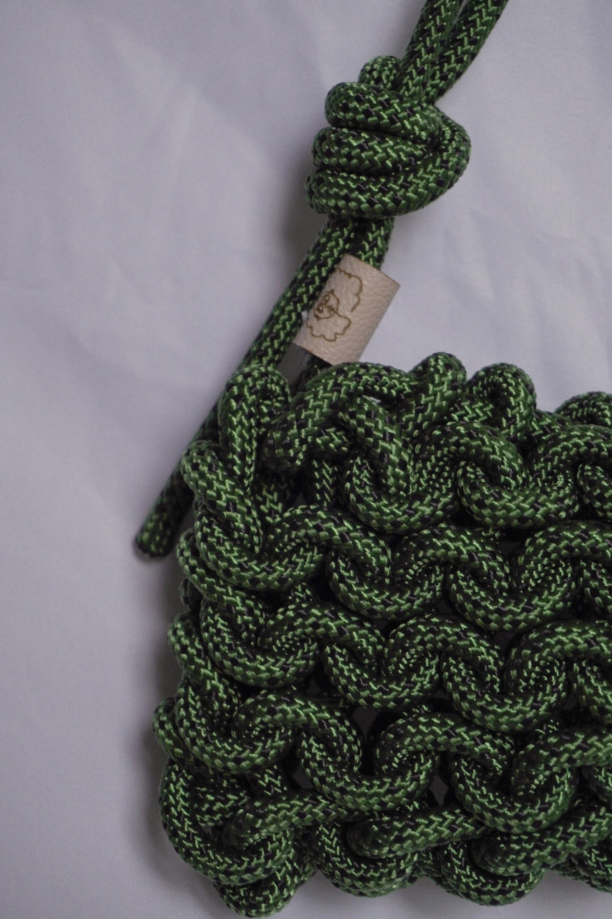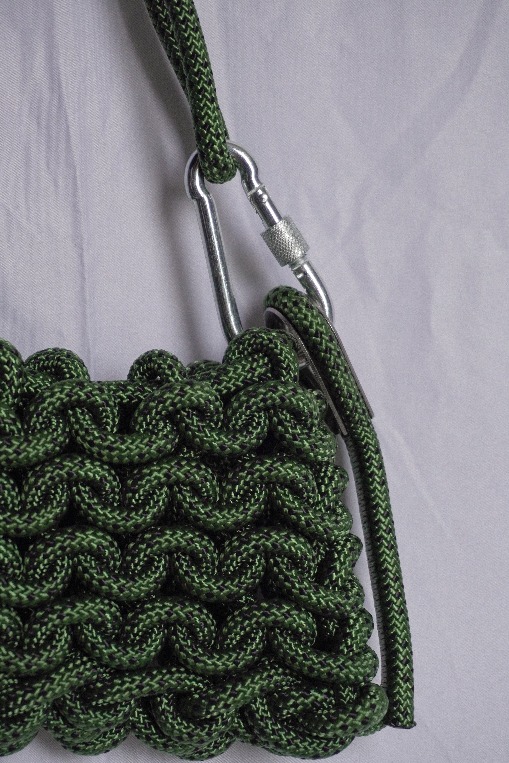 Belay shoulder bag/crossbody (asa ajustable) tejida a mano con cuerda en color verde militar con detalles negros. Cada pieza es única e irrepetible, ya que está elaborada de forma artesanal. Incluye un mosquetón que la hace funcional y distintiva.